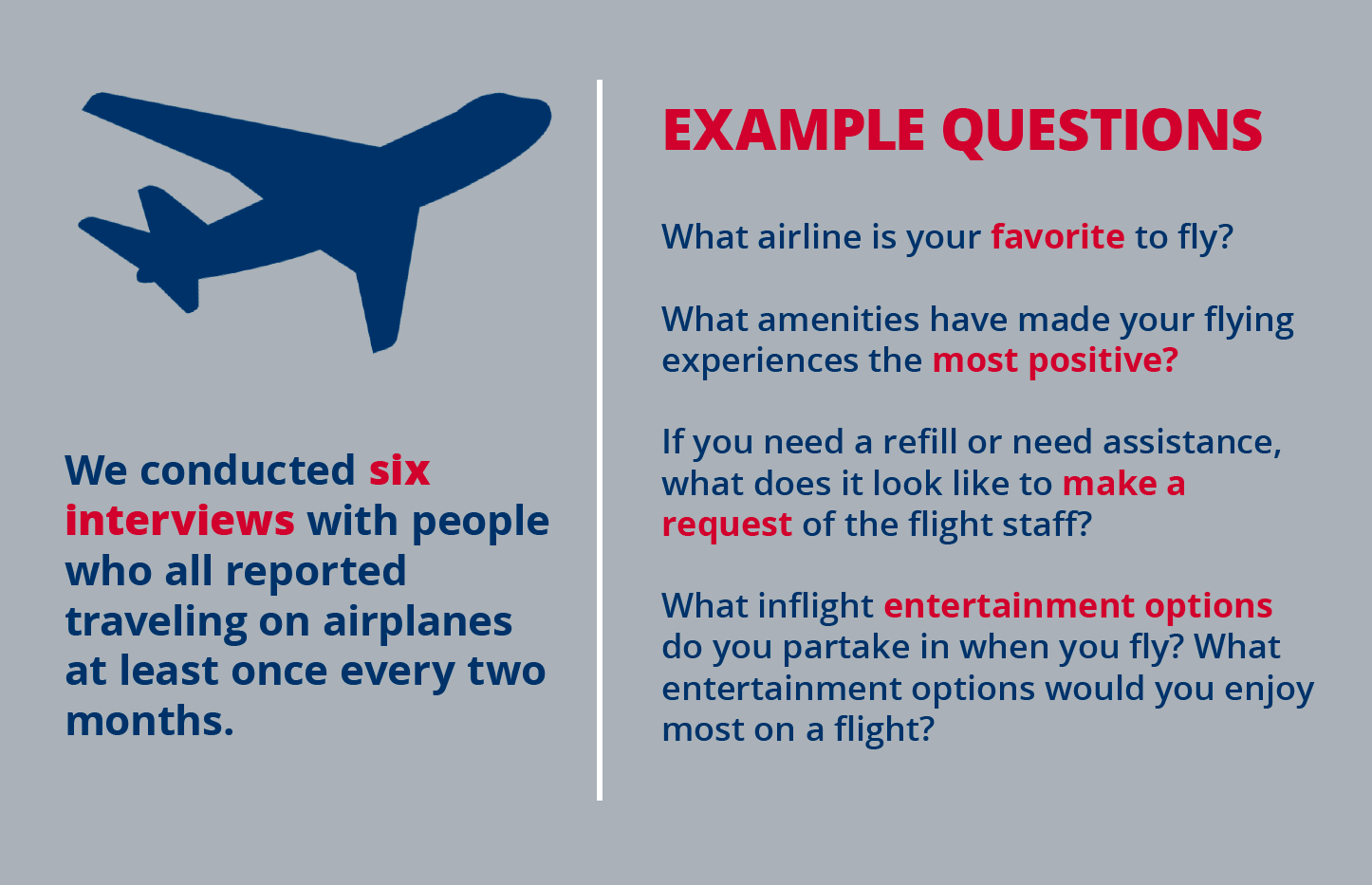 Our team set out to interview six users, ranging from age 25 to 38, who all answered our initial screenings inquiring about their flight habits.